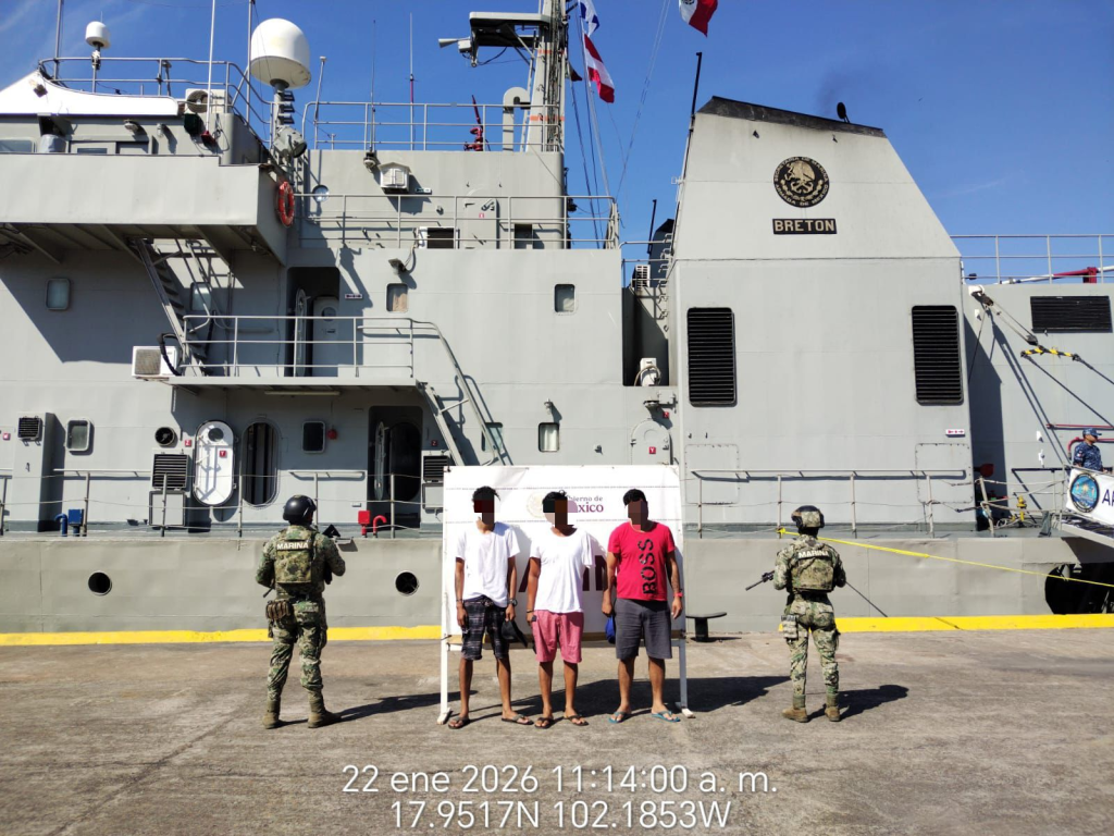 Lázaro Cárdenas, Mich.- La Secretaría de Marina, a través de la Armada de México, informa que en días pasados, en el marco de las acciones permanentes para mantener el Estado de derecho, personal naval en coordinación con la Fiscalía General de la República (FGR), logró la detención de tres presuntos transgresores de la ley que transportaban a bordo de una embarcación menor con dos motores fuera de borda, más de 1,043 litros de combustible contenida en 23 bidones.