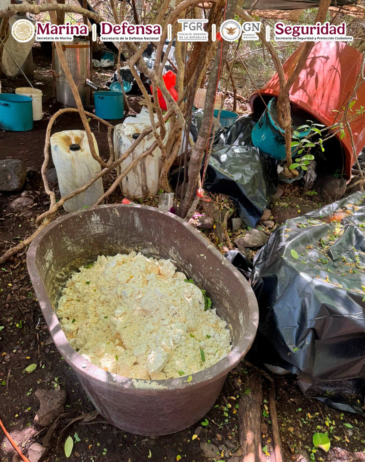 Los efectivos, al realizar recorridos terrestres, localizaron un laboratorio de aproximadamente 80 por 30 metros, en el cual aseguraron 950 kilogramos de metanfetamina, 1,600 litros de precursores químicos líquidos y 1,625 kilogramos de precursores químicos sólidos, así como material diverso, con los cuales se pudo llegar a producir hasta 245 kilos de metanfetamina.