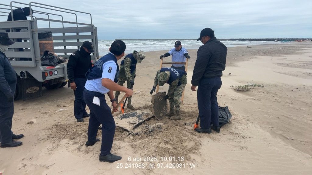 Se mantienen acciones para la contención de hidrocarburo en las costas del estado de Tamaulipas; en este contexto, personal de la Secretaría de Marina hoy recorrió aproximadamente 17 kilómetros en las playas Puerto Morelos (Mezquital) y Costa Azul (Bagdad), donde se recolectaron aproximadamente 236 kilogramos de hidrocarburo.