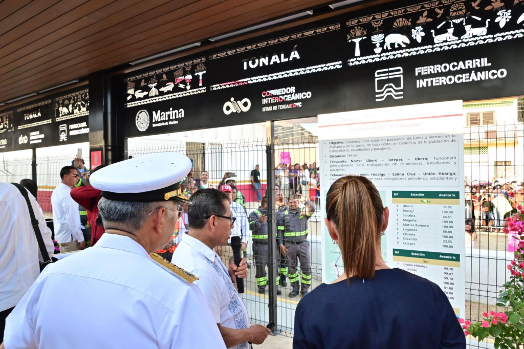 Durante el evento, la Presidenta, junto con las y los funcionarios presentes, llevó a cabo el corte inaugural del listón de la estación ferroviaria de Tonalá, Chiapas, así como la develación de la placa, con el que dio por reactivado el transporte de pasajeros. Asimismo, a lo largo del trayecto se realizaron actos simbólicos de corte de listón en las estaciones de Arriaga (donde también se efectuó un recorrido por el parque lineal), Chahuites y Juchitán, donde la población fue testigo del avance de esta obra ferroviaria que fortalecerá la integración logística de México con Centroamérica.