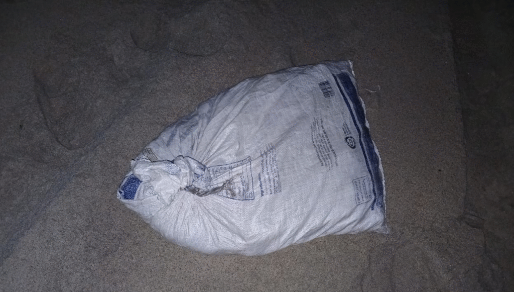 Esta acción se llevó a cabo durante un recorrido de vigilancia terrestre nocturno, realizado para evitar la extracción ilegal de huevos en la primera arribada de la temporada 2025-2026, durante el cual, avistaron tres costales blancos que contenían aproximadamente 1,800 huevos cada uno. Éstos fueron asegurados y entregados al personal de PROFEPA para su custodia y traslado al campamento Tortuguero de la playa, donde recibirán el tratamiento correspondiente para su conservación.