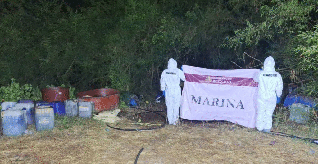 San Blas, Nayarit. – La Secretaría de Marina a través de la Armada de México, por conducto de la Décima Zona Naval, informa que ayer, en coadyuvancia con la fiscalía general de la República personal naval localizó y neutralizo, químicos líquidos y sólidos, así como equipo empleado presuntamente para la elaboración de estupefacientes, en inmediaciones del poblado de Boca del Asadero en el municipio de San Blas, Nayarit.